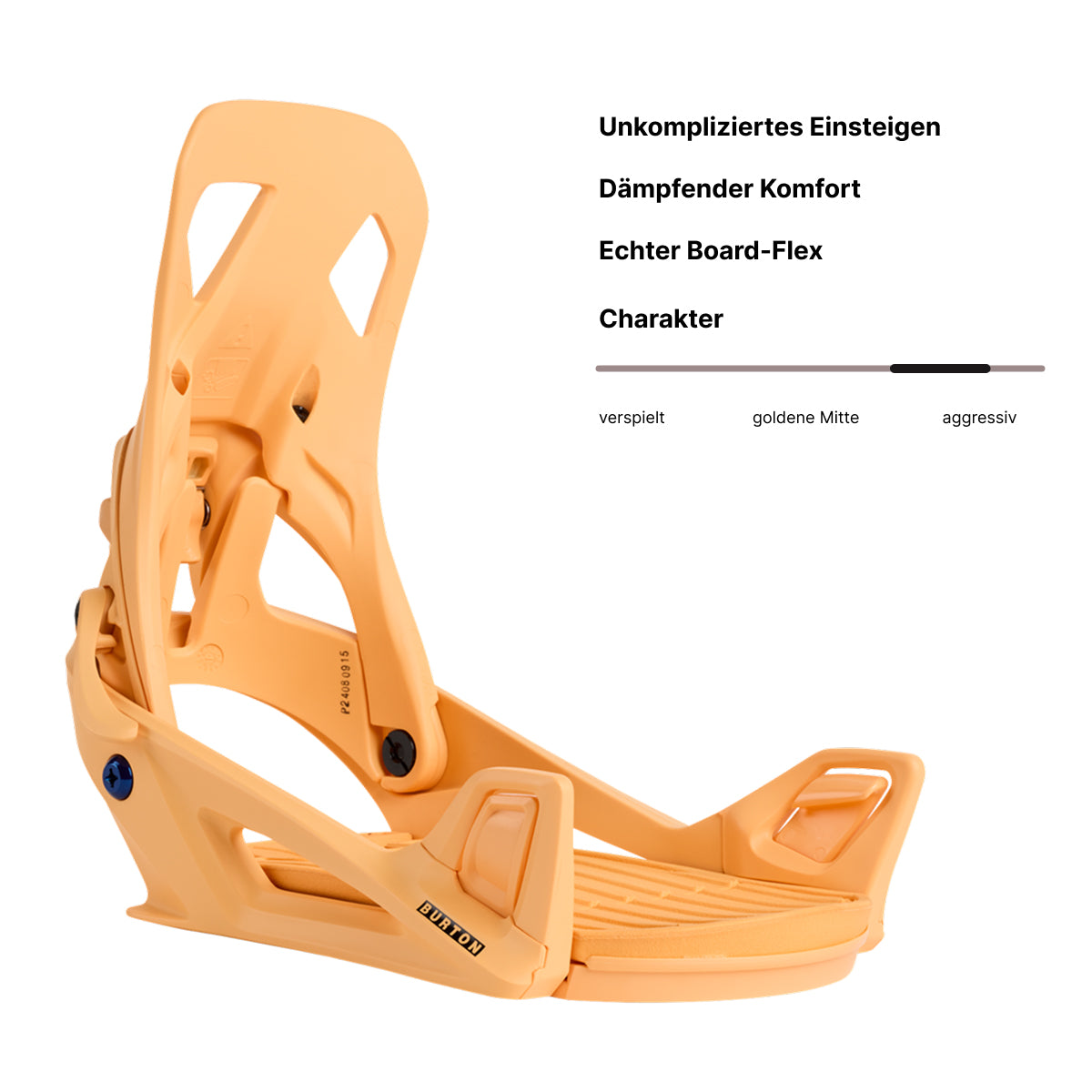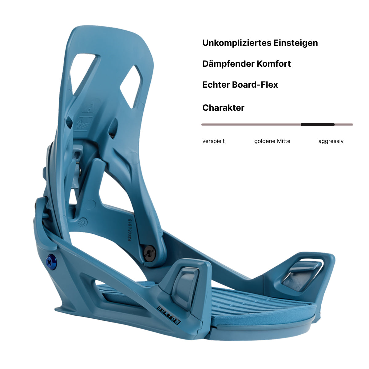 Unkompliziert. Sicher. All-Mountain. Mach einen Schritt nach vorne mit Step On®. Die Burton Step On® Re:Flex Snowboardbindung für Herren verbindet eine intuitive Boot-to-Bindung-Verbindung mit All-Mountain-Performance. Drei Verbindungspunkte – zwei an den Zehen und einer an der Ferse – sorgen für unvergleichliche Einfachheit, Sicherheit und Boardkontrolle.