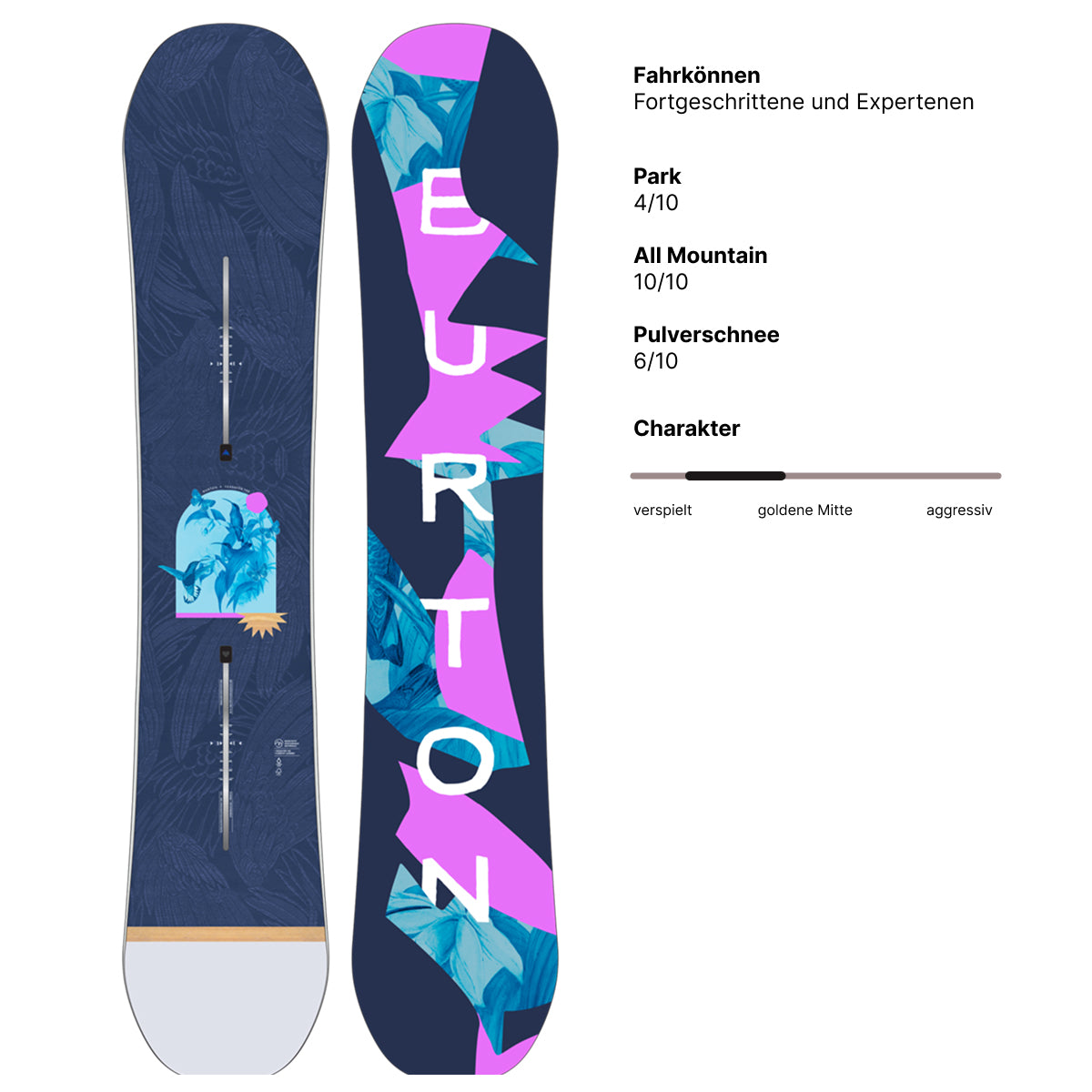 • Damenspezifischer Flex Das frauenspezifische Layup bietet leichteren Ridern drehelastisch weicheren Flex, ohne Kompromisse bei Power und Ansprechverhalten.